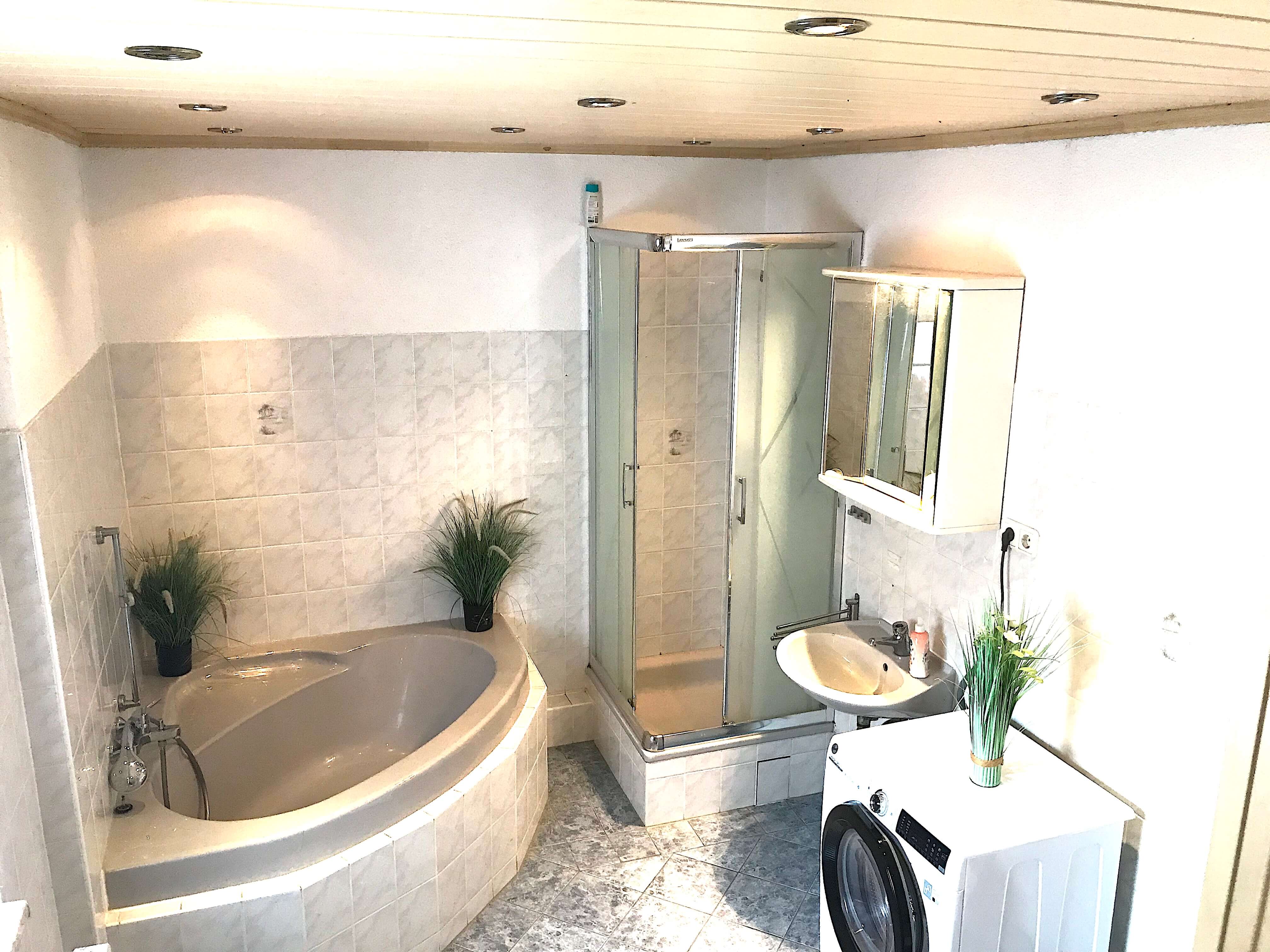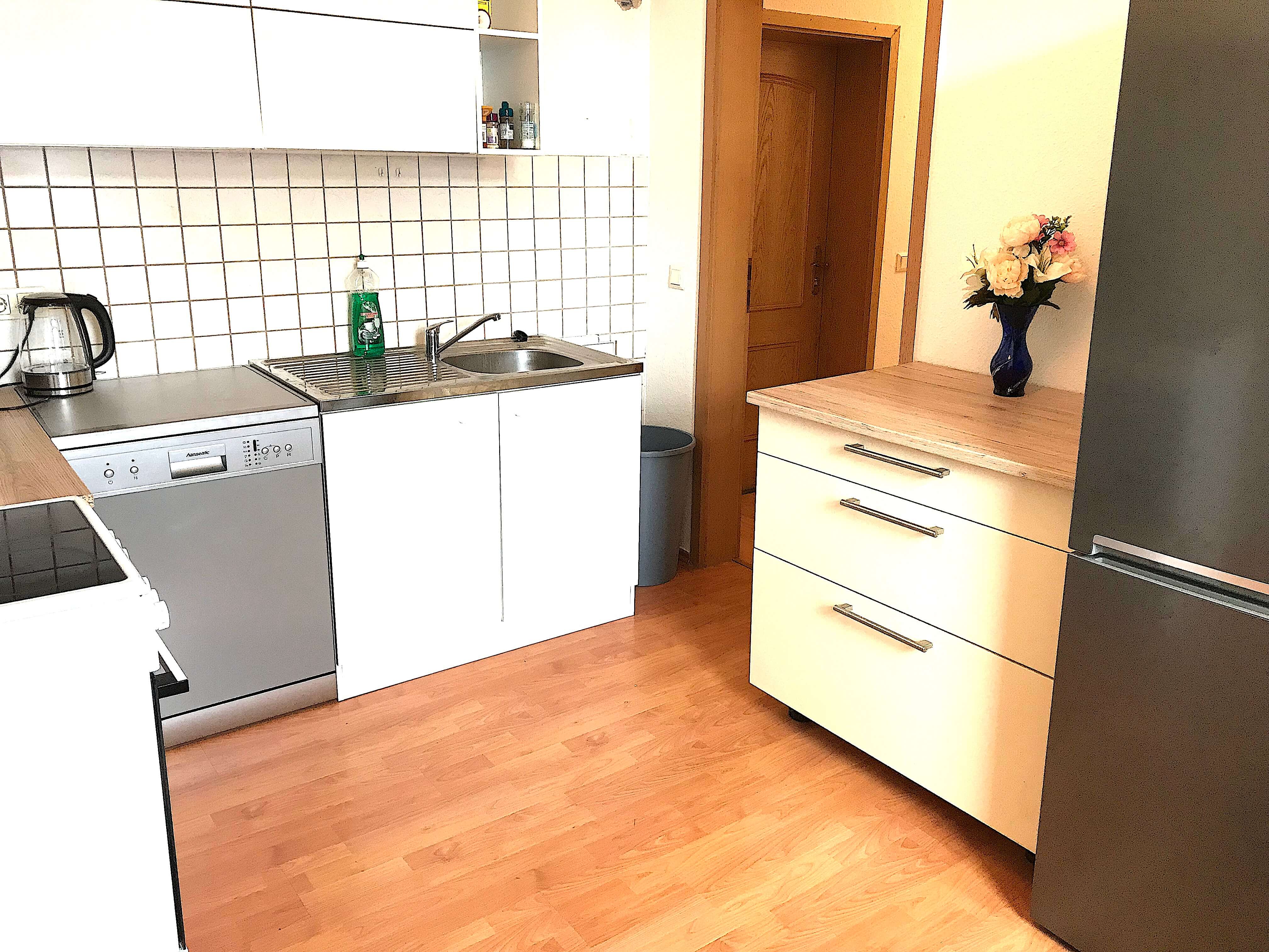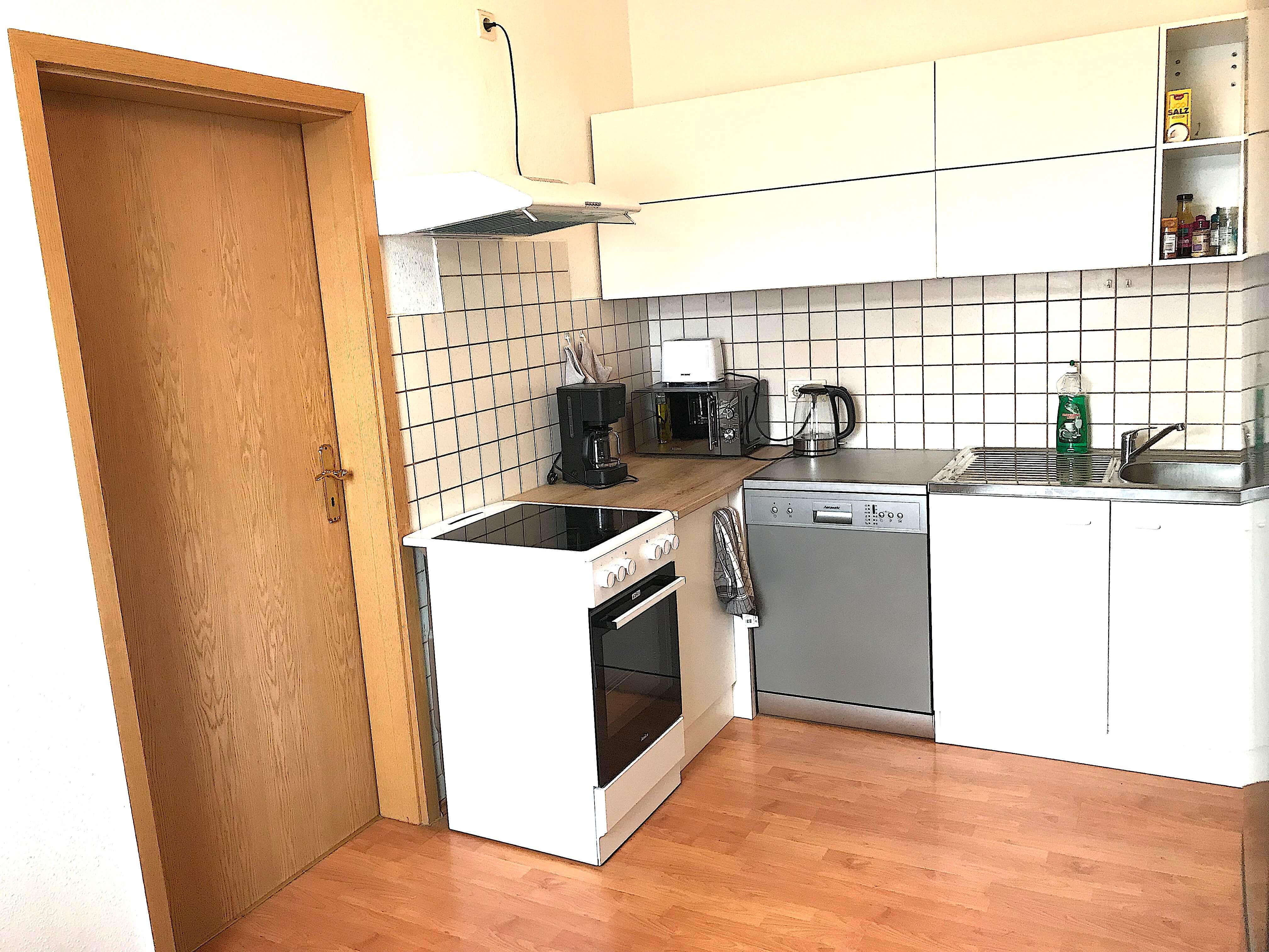 Küche komplett eingerichtet (Herd, Kühlschrank, Spülmaschine, Toaster, Kaffeemaschine). Wasch trockner in der Wohnung. WLAN und TV inklusive. Parkplätze direkt vor Ort.
