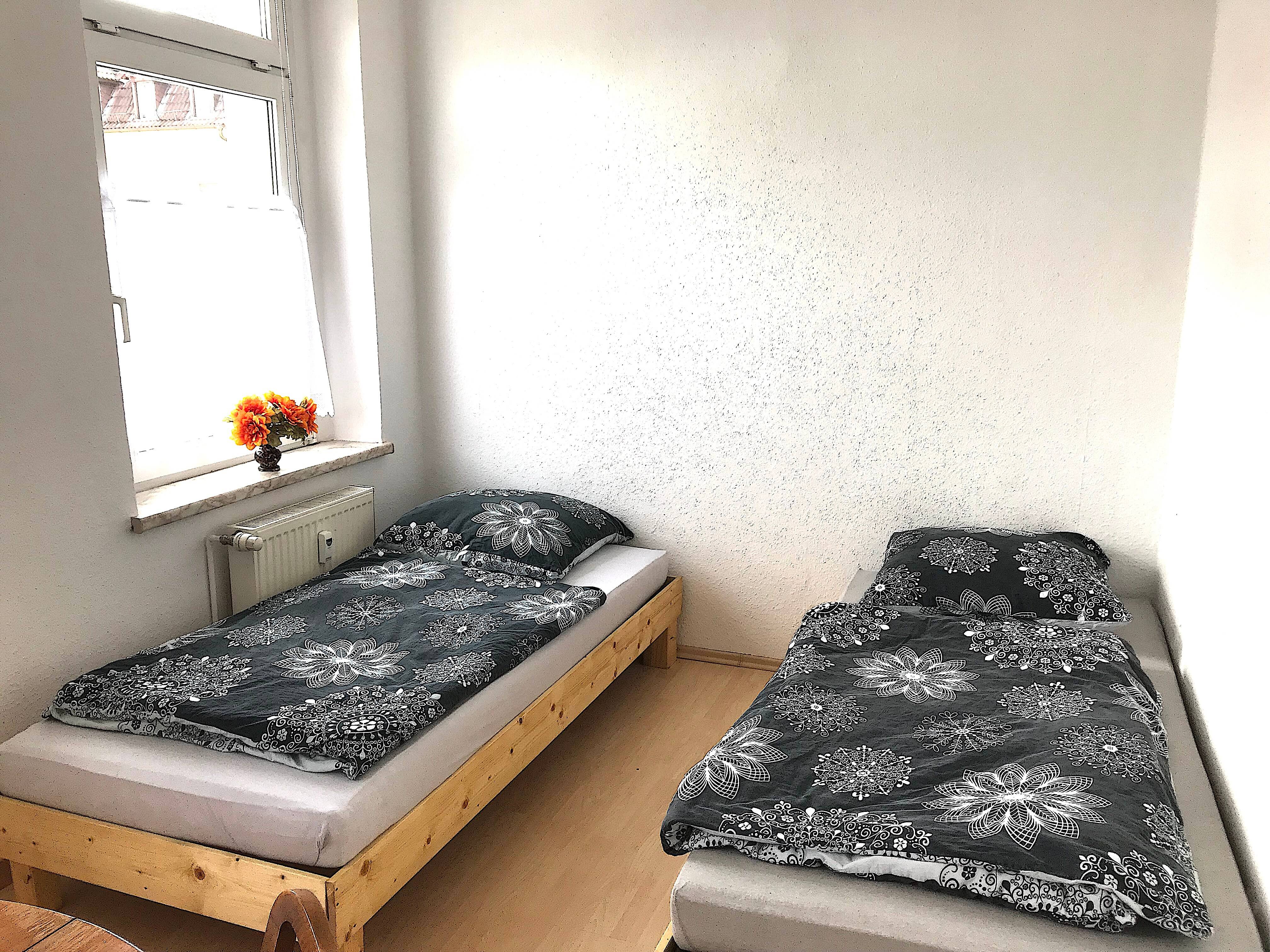 Aufteilung: ein Zweibettzimmer, ein Dreibettzimmer, dazu ein Wohnzimmer.